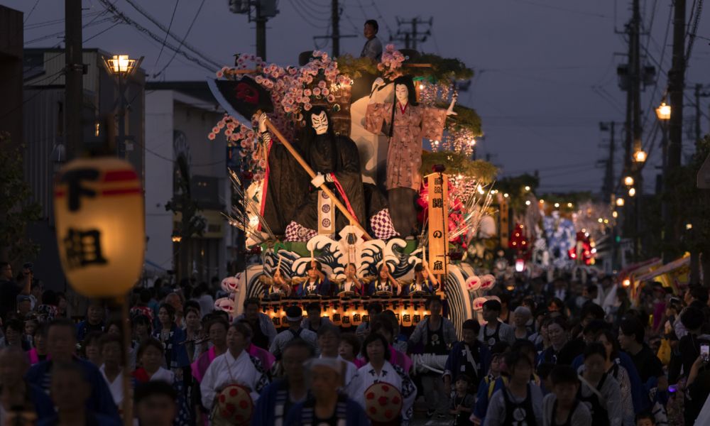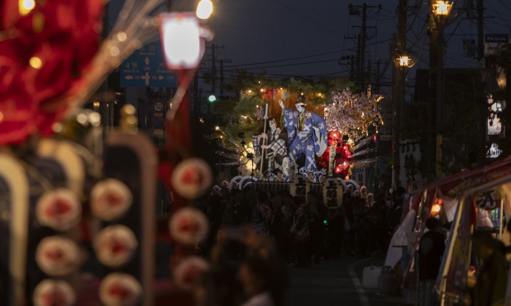 まつりの呼び物である山車は、昔ながらの大八車が用いられ、飾りつけは歌舞伎十八番や歴史上の名場面が選ばれます。