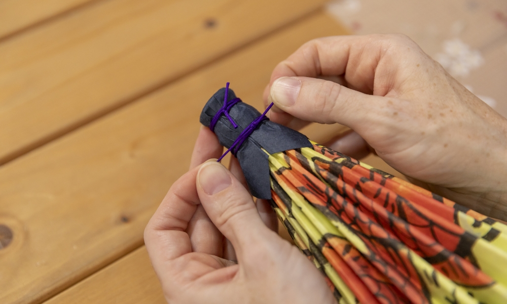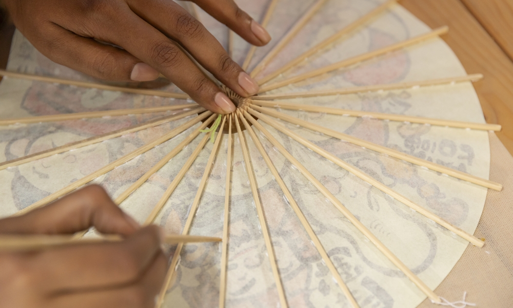 200年以上花巻に伝承される和傘「花巻傘」。花巻で唯一伝統を守り続ける職人が、工房内で壁掛け傘づくりを優しくレクチャーします。